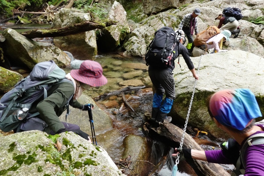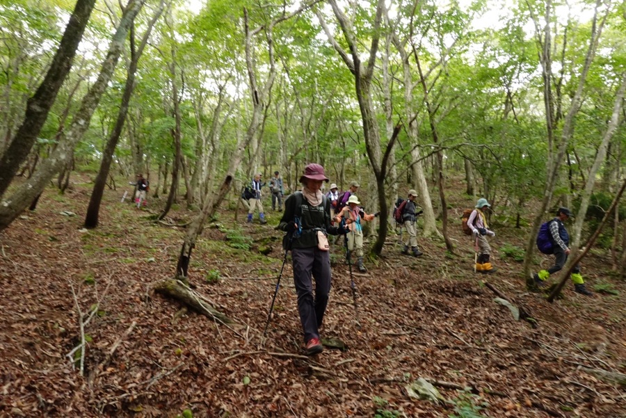 ◆今にも雨が降り出しそうなどんよりした雲行きの中、皆さんの足並みが揃い、元気に歩かれ、雨に遭うことなく早い時間に下山できました。険しい渡渉、厳しい登山道をチョッと冷や汗をかき、ナガオ尾根に、ほっとしたところで昼食予定地にはハチ! 急遽移動する。広い尾根からスゲ原、広谷の湿地の長閑な雰囲気の中をのんびりと歩き、最後の大摺鉢も難なく渡渉、参加の皆さまのご協力があればこそ、ありがとうございました。