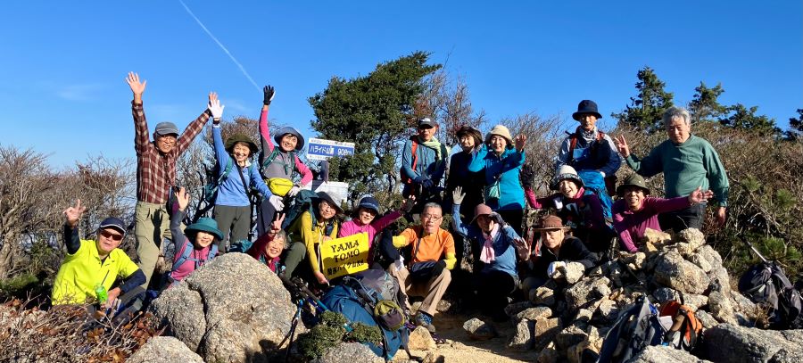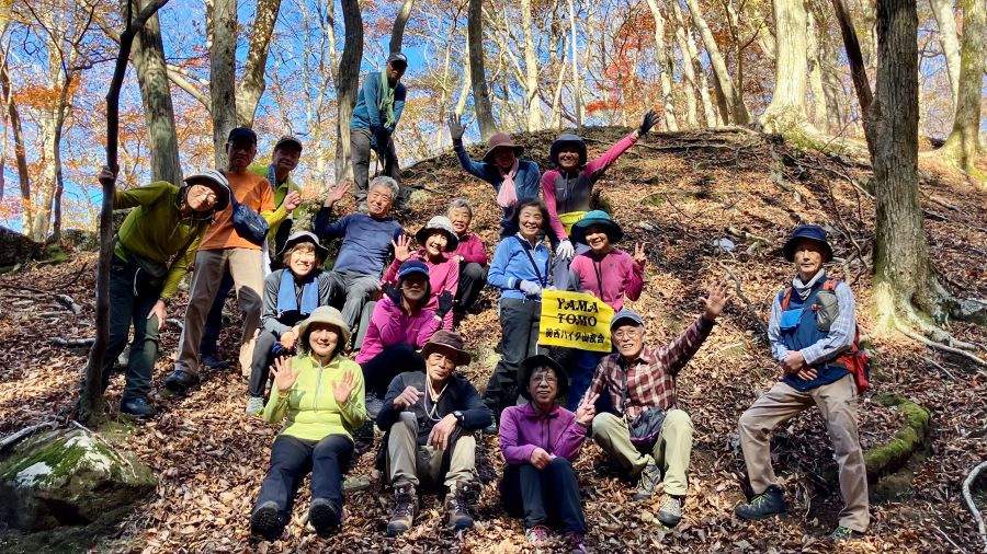 ◆紅葉シーズンの鈴鹿はいつもたくさんの登山者でにぎやかです。朝明渓谷に着いた頃には、すでに第一駐車場はいっぱいで、第二駐車場からのスタートになりました。ほとんどの登山者は釈迦ヶ岳方面へ向かいましたが、私たちはブナ清水をめざして歩き始めました。途中、雲一つない青空に紅葉した赤や黄の葉が映えてきれいでした。ブナ清水では、「G例会で毎年ここに来たね」「ここで飲んだGリーダーのコーヒーはおいしかったなあ」と、Gリーダーを懐かしむ声があちこちで聞こえてきました。登るのにちょっと勇気が必要なきのこ岩では、何人かがその前で記念写真を撮っていました。青岳を過ぎた所で、国見岳や伊勢湾を見ながら昼食にしました。その後、桃岩、国見岳、石門、マグロ岩を周回してハライドに向かいました。始めは緩やかなアップダウンなので、歩きながらの会話も聞こえてきましたが、途中から激下りになり、緊張感で話し声もしなくなりました。難所では足の置き場などをみんなで声をかけ合い、慎重に下っていきました。激下りの後は、一息つく間もなく山頂への登り返しです。岩場やザレ場が続きましたが、力をふりしぼって登っていきました。山頂に着いた皆さんは、疲れてはいたけれど達成感いっぱいの顔でした。