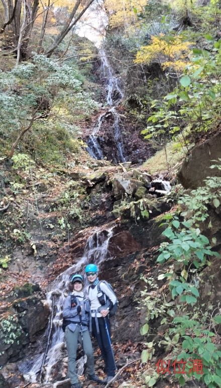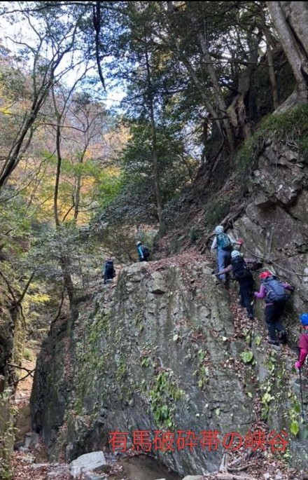 ◆暖かな日差しの中、最高の登山日和となった。行きのバスは全員乗車が危ぶまれる超満員。運行も遅れ、有馬からのスタートも30分遅れた。裏六甲は既に紅葉のピークを過ぎていたが、錦の落ち葉の絨毯に癒されながら、深い森へと心を弾ませた。オノエヤナギ群落上部の白石滝の広場で食事休憩とし、健脚者だけで百間滝、似位滝がある峡谷へと岩登りを始めた。僅かなホールドも手掛かりの突起も浅く薄くなり、落ち葉に隠され、難儀しましたが、無事、紅葉に包まれた美しい似位滝までピストン出来ました。帰りは明るい広葉樹の森に癒され、水車小屋跡まで計画通り下ることが出来ました。