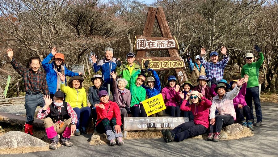 ◆紅葉が終わった晩秋の御在所岳を中登山道コースで登っていきました。登山口から山上公園近くの富士見岩までは急登と岩場の連続で、ハーハーとヒヤヒヤで汗をいっぱいかきました。「岩場大好き、楽しい!」という人もいれば、「あーしんど、もう足が上がらへん!」という人もいました。先頭と最後尾の間隔があいたので、展望のいい場所で景色を見ながら後続を待つことにしました。目の前に釈迦ヶ岳や鎌ヶ岳、それに赤色のかわいいロープウェイが見えました。山上公園で昼食後、スキー場を通り抜けて御在所岳山頂に向かいました。山頂近くの望湖台では、雨乞岳など鈴鹿の山々を一望できました。長者池では、がん封じのドラを鳴らして無病息災をお願いしました。鎌ヶ岳を正面に見ながらの下山ルートは、岩場や滑りやすい斜面があるので、コースタイムよりも多めに時間をかけて、慎重に下りるようにしました。