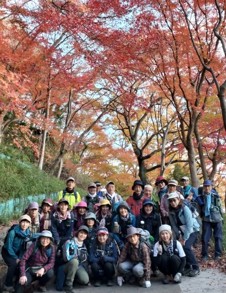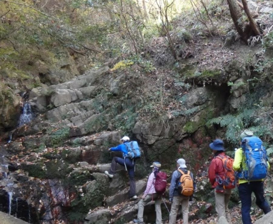 ◆今回も素晴らしい好天に恵まれた。集合時は曇天、谷筋に突入する頃には爽やかな日差しに包まれた。4〜5mの滝が次々と現れる芦屋地獄谷。しっかりホールドを掴める岩登りだが、油断せず、全員で慎重に取り付きクリアした。堰堤に突き当たる手前で古い石垣が残るガレ場を登り、尾根筋の一般道に合流し、風吹岩の手前を荒地山南の小川へ向けて乗り越した。落葉で消されたルートを黒岩がある西寄りへ変更し、荒地山へ登頂した。帰りは緩やかな西面ルートで宝寿水を見学してから横池へ向けて転進し、八幡谷を経由して保久良神社脇へ下山した。西日に照らし出された、紅葉に染まる保久良の森は美しい輝きに満ちていた。