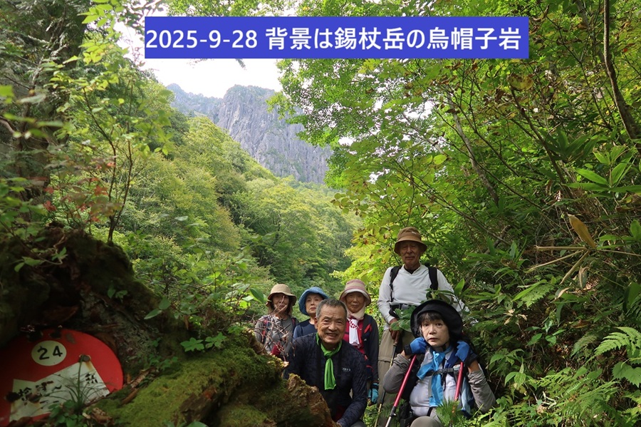 ◆両日雨予報でどう成るかと思いましたけど、雨は夜から朝に成りましたので予定を変え、初日に錫杖岳の岩が見られる場所に行けました。二日目ですと雨ですから沢が渡れなかった。4回目の挑戦で烏帽子岩の姿眺められました!! 高さは450mも有り、錫杖岳に行った四人に、帰り抜かれましたが朝5時半から行かれてた。