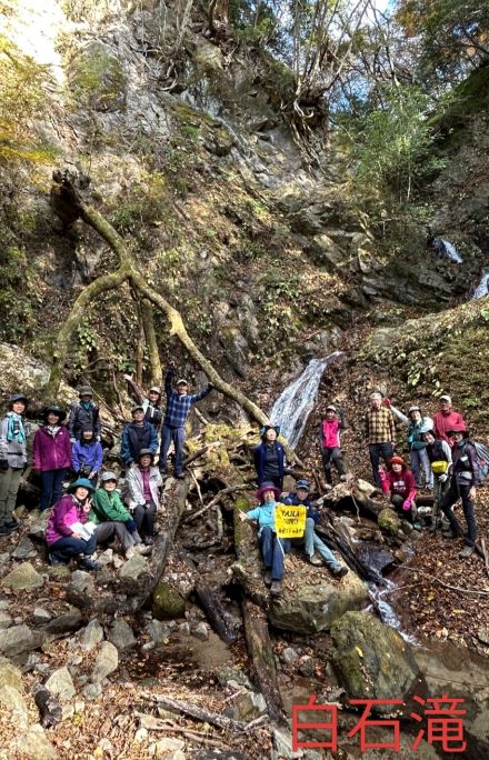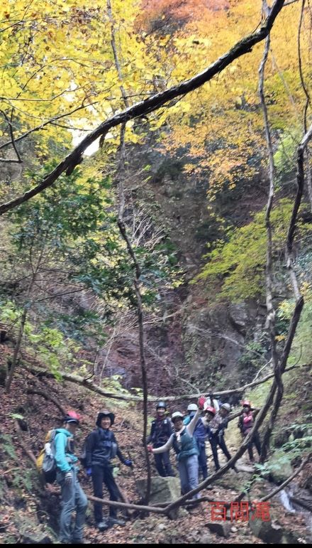 ◆暖かな日差しの中、最高の登山日和となった。行きのバスは全員乗車が危ぶまれる超満員。運行も遅れ、有馬からのスタートも30分遅れた。裏六甲は既に紅葉のピークを過ぎていたが、錦の落ち葉の絨毯に癒されながら、深い森へと心を弾ませた。オノエヤナギ群落上部の白石滝の広場で食事休憩とし、健脚者だけで百間滝、似位滝がある峡谷へと岩登りを始めた。僅かなホールドも手掛かりの突起も浅く薄くなり、落ち葉に隠され、難儀しましたが、無事、紅葉に包まれた美しい似位滝までピストン出来ました。帰りは明るい広葉樹の森に癒され、水車小屋跡まで計画通り下ることが出来ました。