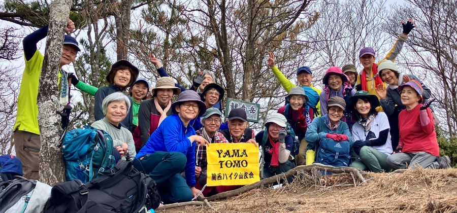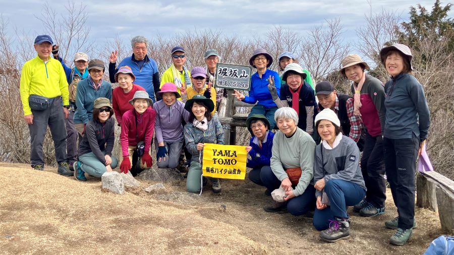 ◆堀坂山は伊勢三山の一つで、地元では「伊勢富士」とも呼ばれ、信仰の山として親しまれています。一週間前は寒波で雪があったのですが、連日の暖かさですっかりとけて、花がまだ咲いていない春の山に登っているようでした。林道を過ぎた分岐から「雲母谷の高」までは、汗が一気にふき出すほどの急登でした。その後、山頂の雄岳まではなだらかな上りが続きました。いつもなら山頂から伊勢平野や伊勢湾が見渡せるのですが、残念ながら霞んでいて見えませんでした。山頂の下と堀坂峠までの途中には、大日如来坐像が安置されていました。堀坂峠から観音岳に向かっては再び上りです。休憩の後、気合を入れて登っていきました。「堀坂峠の高」からは、朝から登った堀坂山が正面に見えました。「あの山を登って下りてきたんや、そら、しんどいはずや!」という声があちこちから聞こえてきました。観音岳山頂からは富士山が見えることがあるそうです。参加者の皆さんは二座登頂して疲れているはずなのに、なぜか足どりは軽く、予定時刻よりも30分早く下山できました。